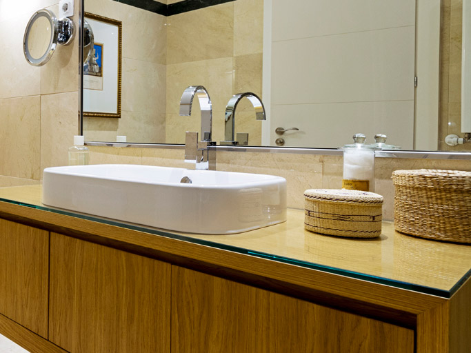 Utilizamos para unificar y aclarar la casa un suelo de roble claro en formato grande que nos hace las estancias más amplias, pintamos la casa en color blanco y diseñamos puertas hasta techo para crear mayor altura.