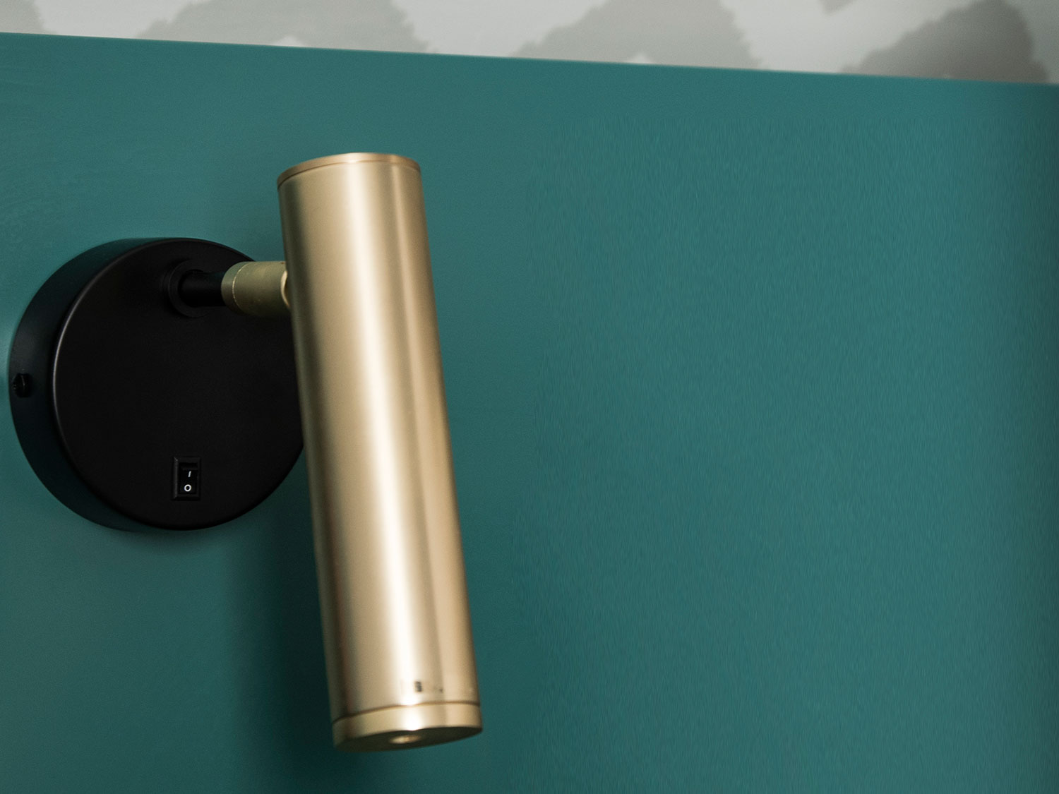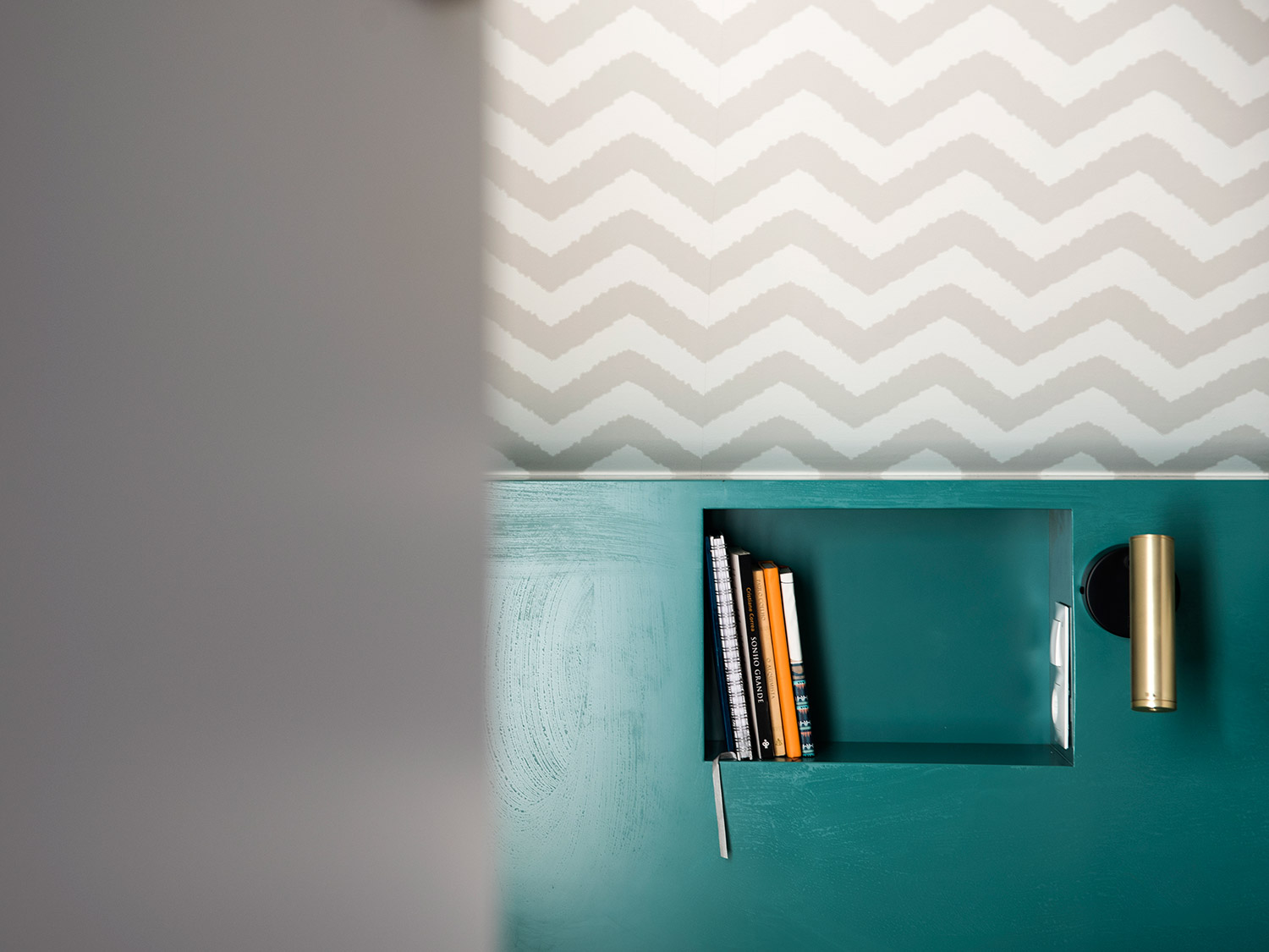 En la zona del dormitorio, utilizamos en la inclinación del techo un papel decorativo que suaviza la caída, diseñamos el cabecero en un color verde atrevido y oscuro para darle mayor profundidad a la habitación.