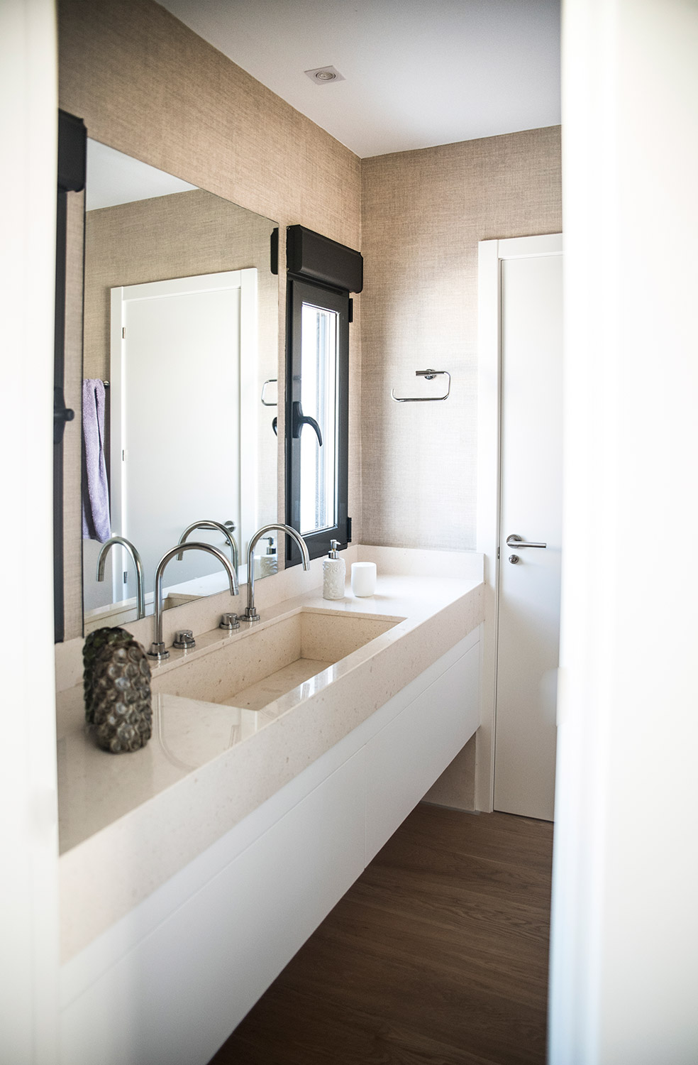 Y en el foco más importante, la zona de despacho diseñamos la mesa en roble como el suelo para no crear ningún corte visual en el espacio y así crear más amplitud. Como siempre en nuestros proyectos utilizamos materiales nobles: madera, mármol que nos aportan calidez.