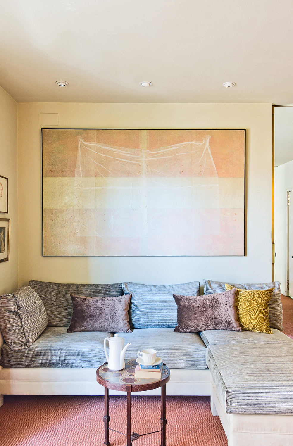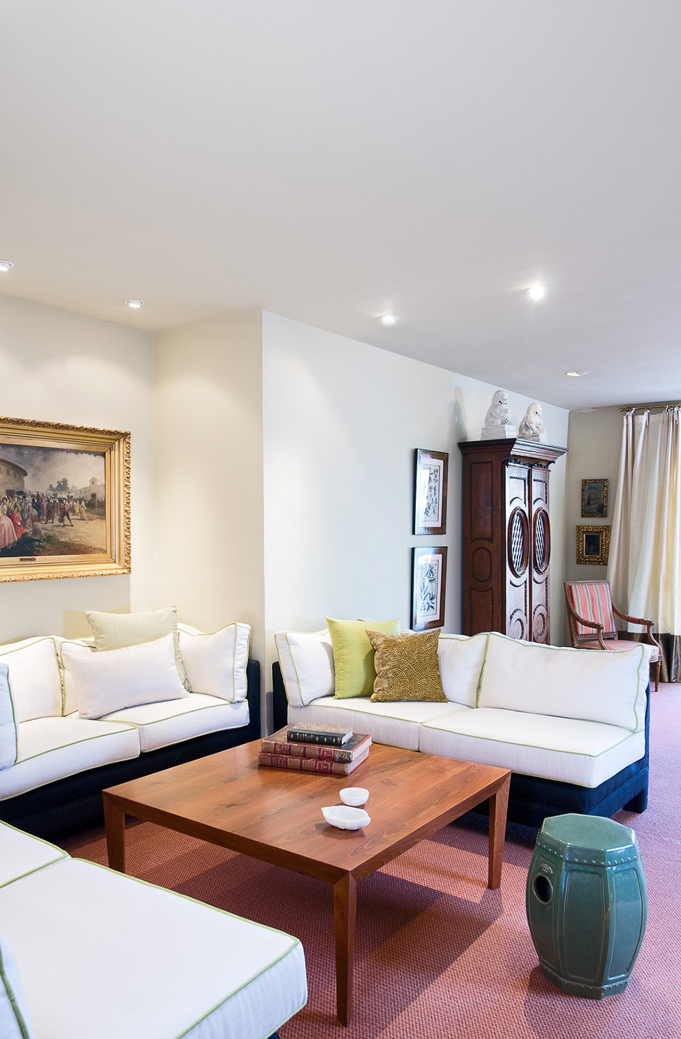El propietario quería mantener la estética de su casa pero modernizando las diferentes zonas de estar. Cambiamos la gama cromática general y diseñamos unos sofás modernos con líneas más depuradas utilizando telas que diesen ese punto más actual. Creamos puntos con mas personalidad en los complementos y muebles auxiliares.